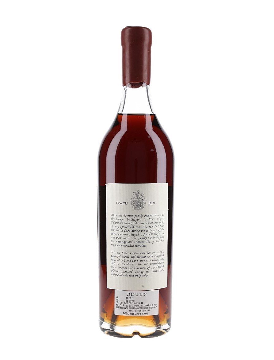 The back label reads: When the Estevez family became owners of the bodega Valdespino in 1999, Miguel Valdespino himself told them about some casks of very special old rum. The rum had been distilled in Cuba during the early part of the 1940s and then shipped to Spain soon after. It was then stored in oak casks previously used for maturing in Oloroso Sherry and has remained untouched ever since.